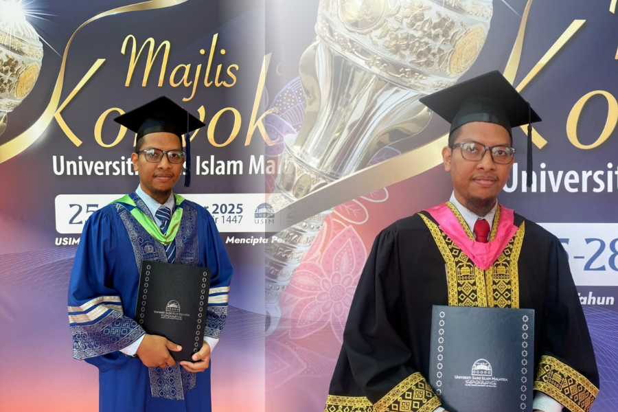 NILAI  – Umar Azlan, 33, dari Negeri Sembilan tampil dengan pencapaian istimewa apabila menerima dua kelayakan akademik dalam satu majlis konvokesyen Universiti Sains Islam Malaysia (USIM). Keunikan pencapaian ini menarik perhatian ramai, sekali gus memperlihatkan komitmen tinggi beliau dalam menuntut ilmu.