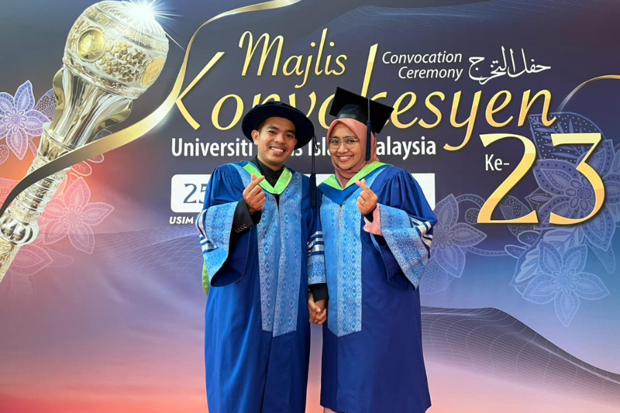 NILAI – Universiti Sains Islam Malaysia (USIM) meraikan kejayaan istimewa pasangan suami isteri, Dr. Muhammad Zaid Abdul Samat, 31, dan Nur Syuhaidah Alimar Syidi, 29, yang menamatkan pengajian masing-masing pada Majlis Konvokesyen USIM ke-23. Dr. Zaid menerima Ijazah Doktor Falsafah (PhD) tajaan Jameel Education Foundation, manakala isterinya bergelar graduan Ijazah Sarjana Al-Quran dan Sunnah.
