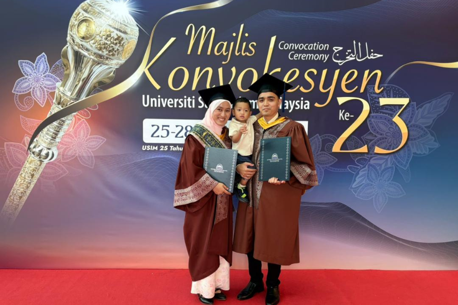 NILAI – Majlis Konvokesyen Universiti Sains Islam Malaysia (USIM) baru-baru ini menyaksikan satu detik penuh emosi apabila sepasang suami isteri, Ahmad Sobri Iman Ahmad Fauzi dan Sharifah Amelia Syed Yazid, naik ke pentas bersama cahaya mata mereka, Ahmad Fateh (1 tahun 6 bulan), meraikan kejayaan keluarga kecil itu. Namun di sebalik senyuman bahagia, tersingkap sebuah kisah perjuangan luar biasa yang membuktikan ketabahan dan kekuatan mental seorang ibu muda.