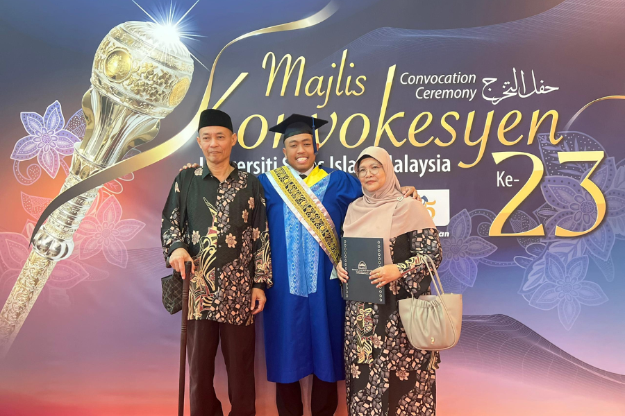 NILAI – Penerima Anugerah Tokoh Maal Hijrah USIM, Muhammad Firdaus Mohd Faisal, 25, selamat bergraduasi bersama 123 graduan Program Dakwah dan Pengurusan Islam Fakulti Kepimpinan dan Pengurusan yang berlangsung pada sidang ketujuh Majlis Konvokesyen ke-23 USIM baru-baru ini. Beliau yang merupakan finalis Anugerah Tokoh Siswa Negara (Kesukarelawanan) turut muncul sebagai mahasiswa berpengaruh melalui gabungan kecemerlangan dalam bidang dakwah, kepimpinan, serta khidmat komuniti.
