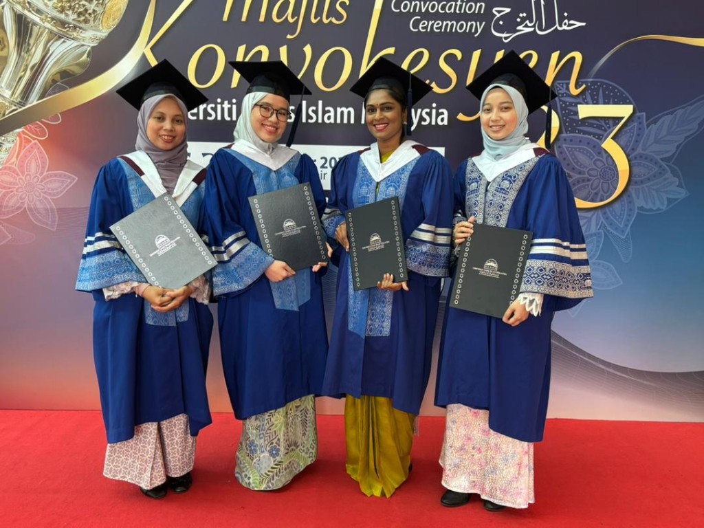 Graduan perintis tersebut ialah Nurul Kauthar Mohamad Khari, 34, Farishah Nur Abd Samad, 32, Vishalah Retna a/p Retnasingam, 39, dan Munirah Mohd Rosali, 36, merupakan antara 204 graduan yang menerima ijazah pada majlis konvokesyen Sidang Pertama yang dikurniakan oleh Duli Yang Maha Mulia Tuanku Canselor USIM, Tuanku Aishah Rohani Almarhum Tengku Besar Mahmud hari ini